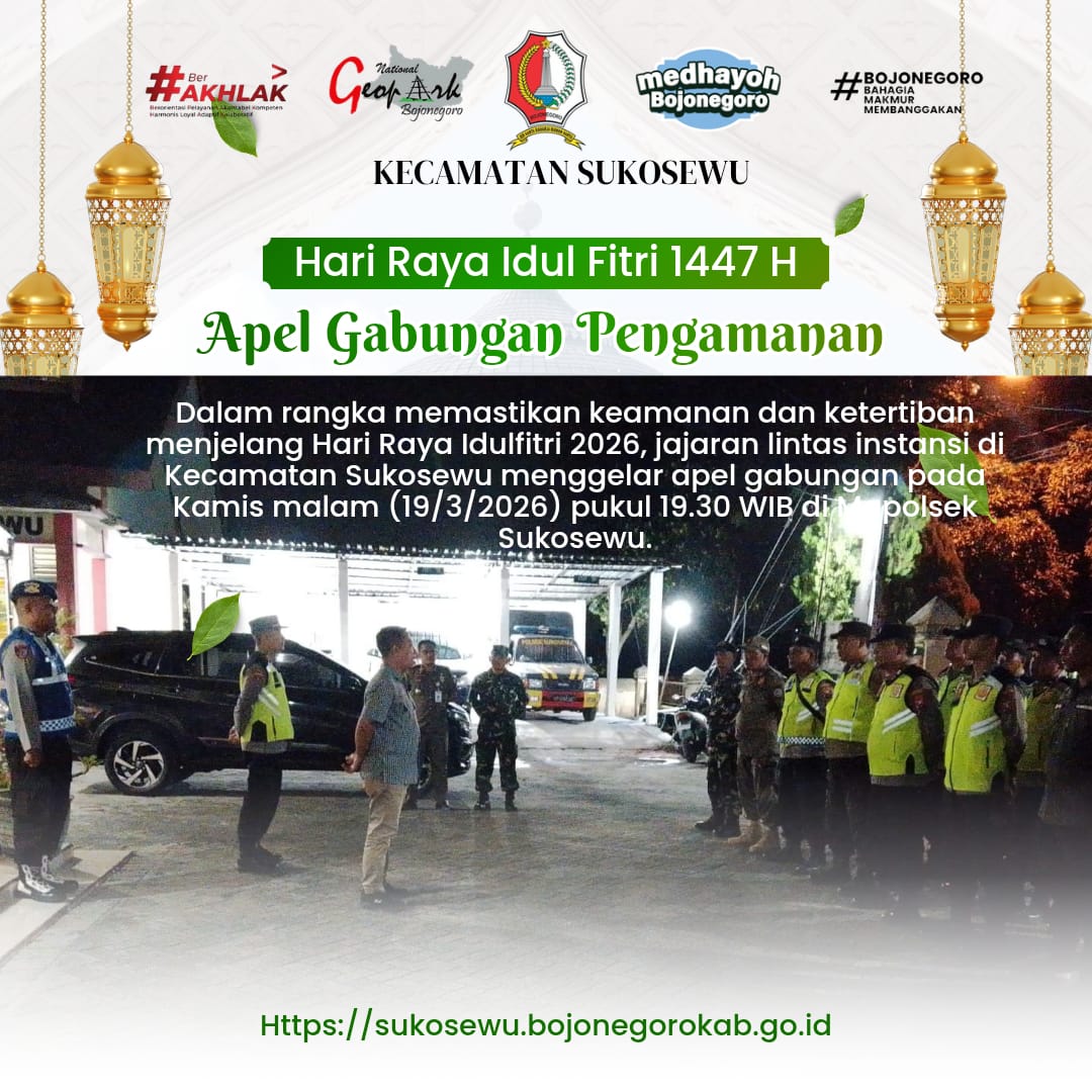 Apel gabungan pengamanan Idul Fitri 1447 H digelar di Mapolsek Sukosewu, Kamis malam (19/3/2026), melibatkan unsur Kecamatan, TNI, Polri, dan Satpol PP sebagai wujud kesiapan menjaga keamanan dan ketertiban wilayah.